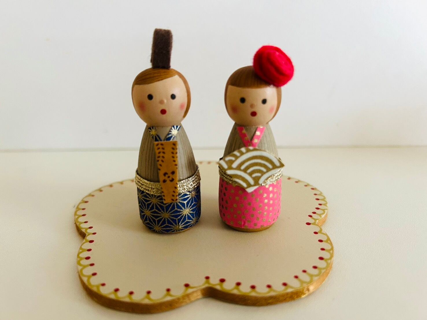 These Hina dolls are decorated with hand-painted details and traditional Japanese washi paper.